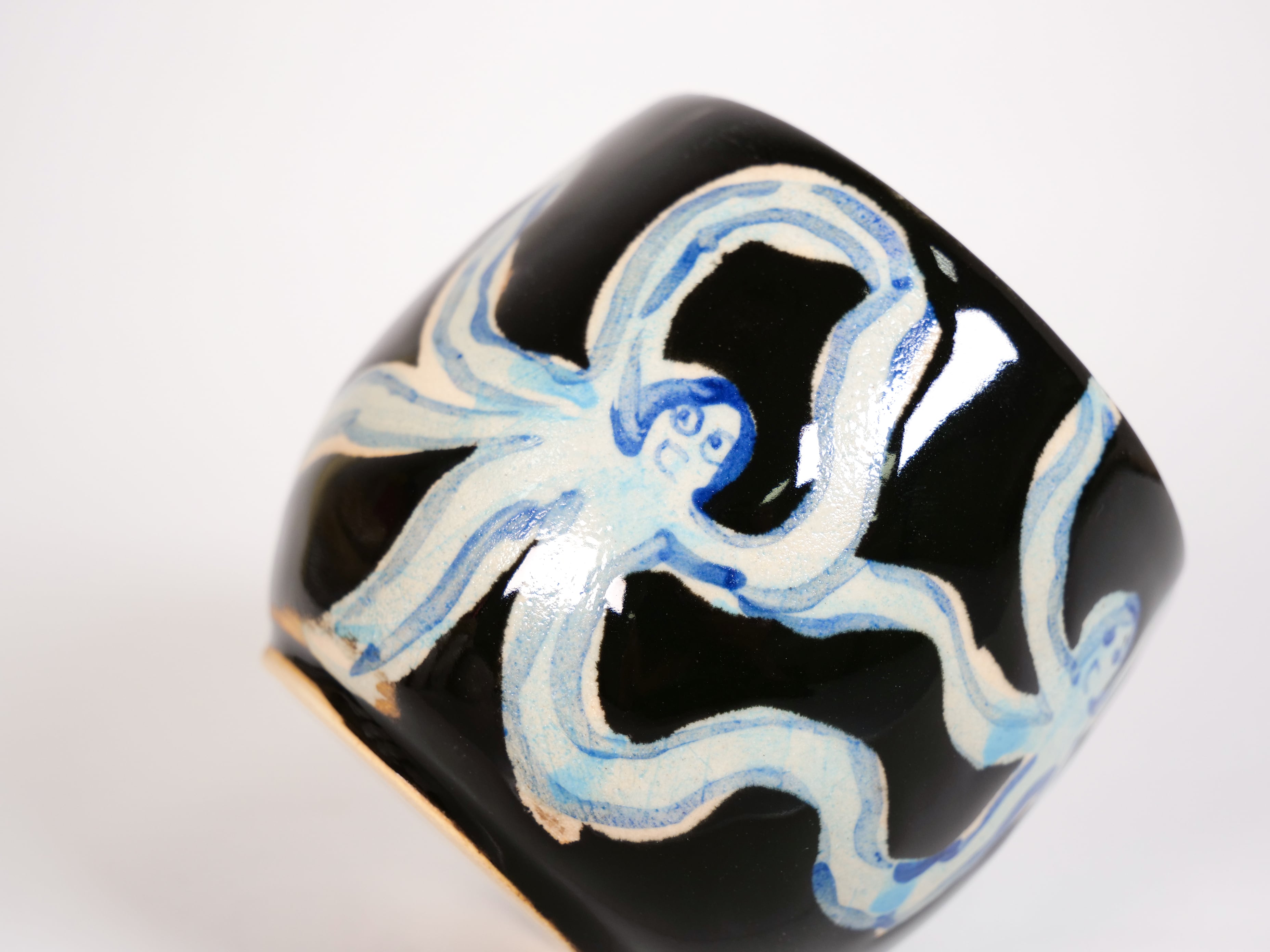薄いブルーと深いブルーと、黒釉薬のコントラストがポイントです。
